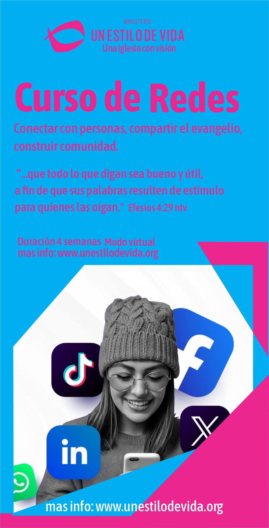 Un curso para aprender a usar las redes sociales con propósito: inspirar, compartir el mensaje de Jesús y edificar comunidad online.